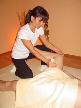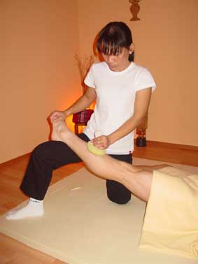 Dampfende thailaendische Heilkraeuter werden aufgetragen.